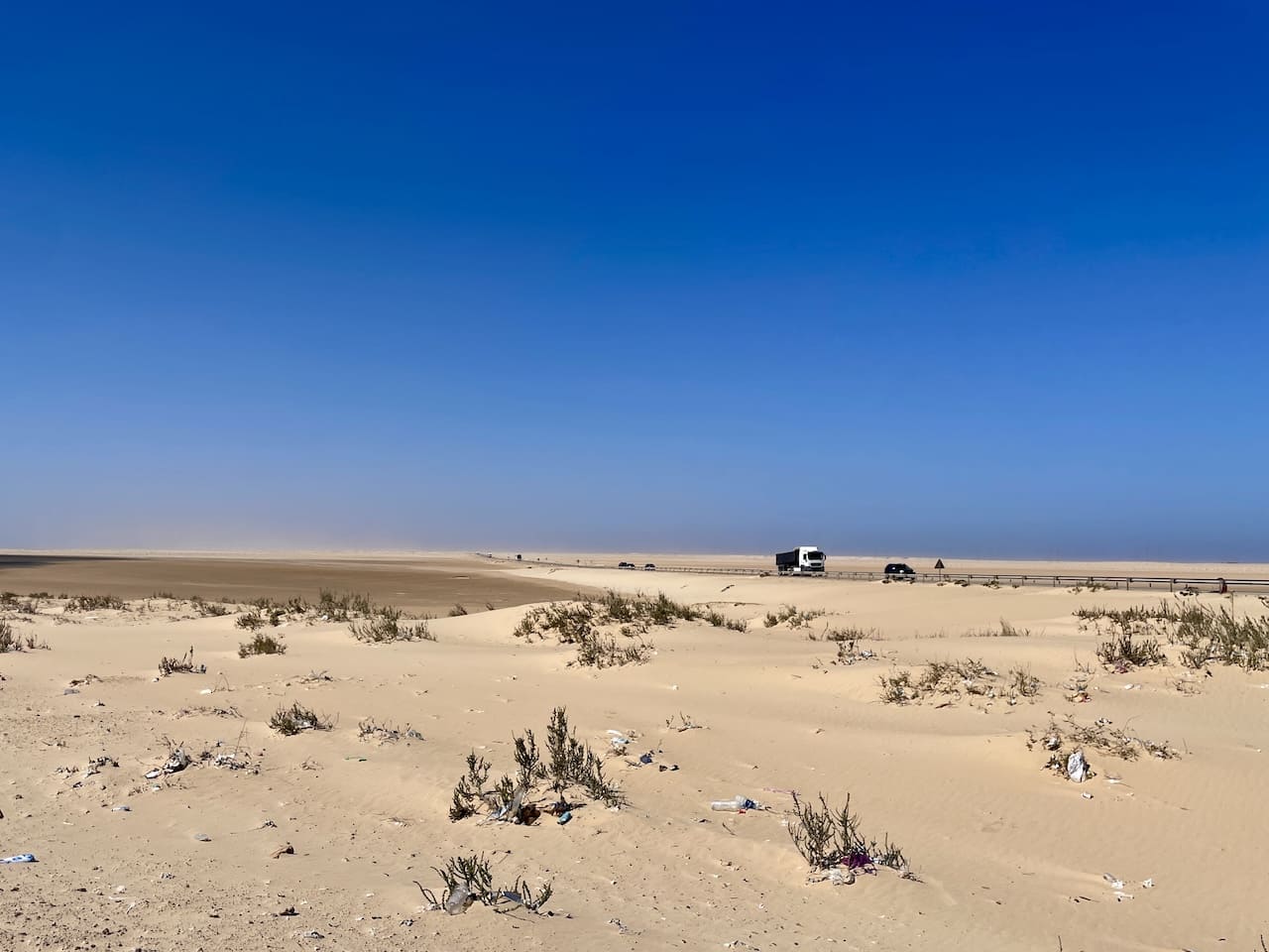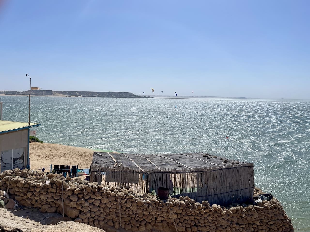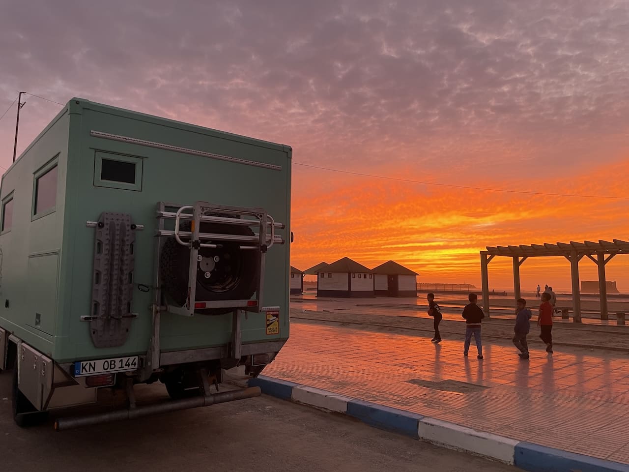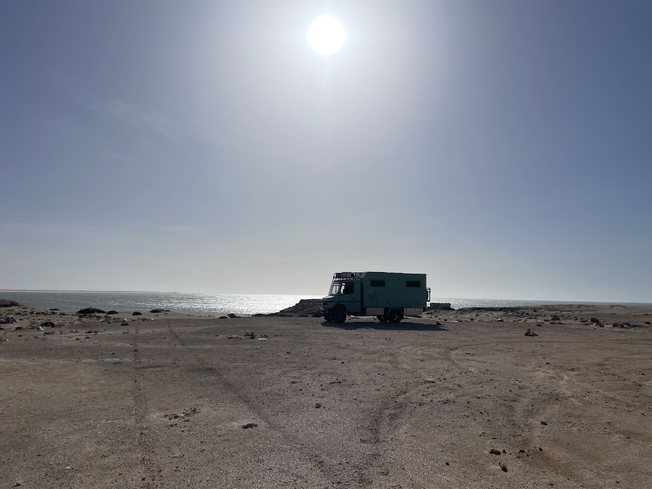 Gleich zu Beginn der Strecke erlebten wir etwas kurioses: Es regnete und zwar nicht gerade wenig. An unserer Strecke durch die Sahara sahen wir immer wieder Wasserpfützen und kleine Seen – das hätten wir so nicht erwartet. Grundsätzlich ist es recht schwer, gute Übernachtungsplätze zu finden. In Dakhla, einem Eldorado für Kite-Sufer (dort fand gerade die Weltmeisterschaft statt) gibt es den berühmten Stellplatz “PK25”. Hier überwintert fast ein ganzes Dorf an Wohnmobilen. Wir waren noch in der “Vorsaison” unterwegs und so teilten wir uns den riesigen Platz mit netten Schweizern und Polen. Zum Kite-surfen braucht man viel Wind, den gibt’s während unserer Reise in Hülle und Fülle. Ich versuchte unseren Kermit immer so im Wind zu parken, daß er möglichst wenig wackelte.