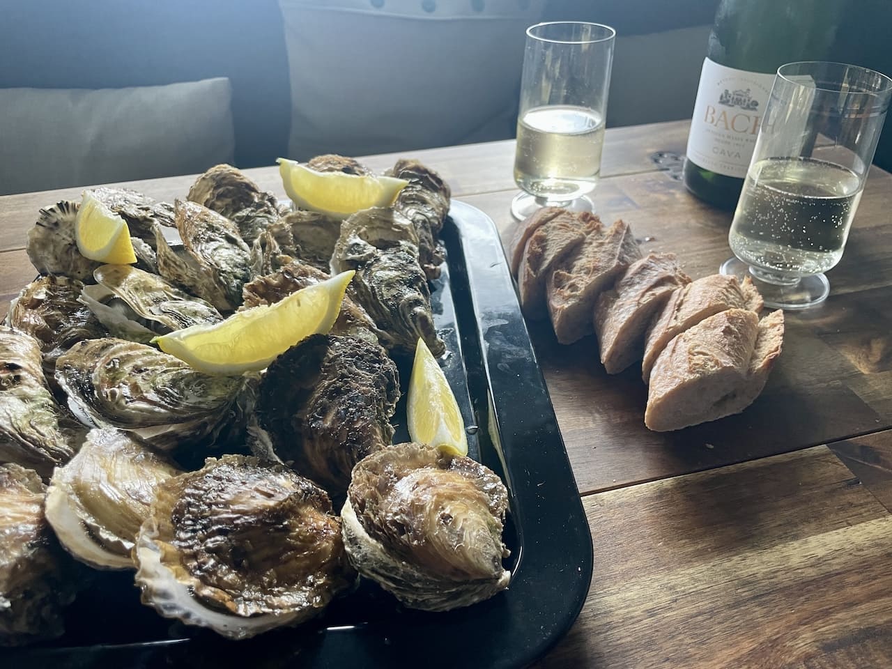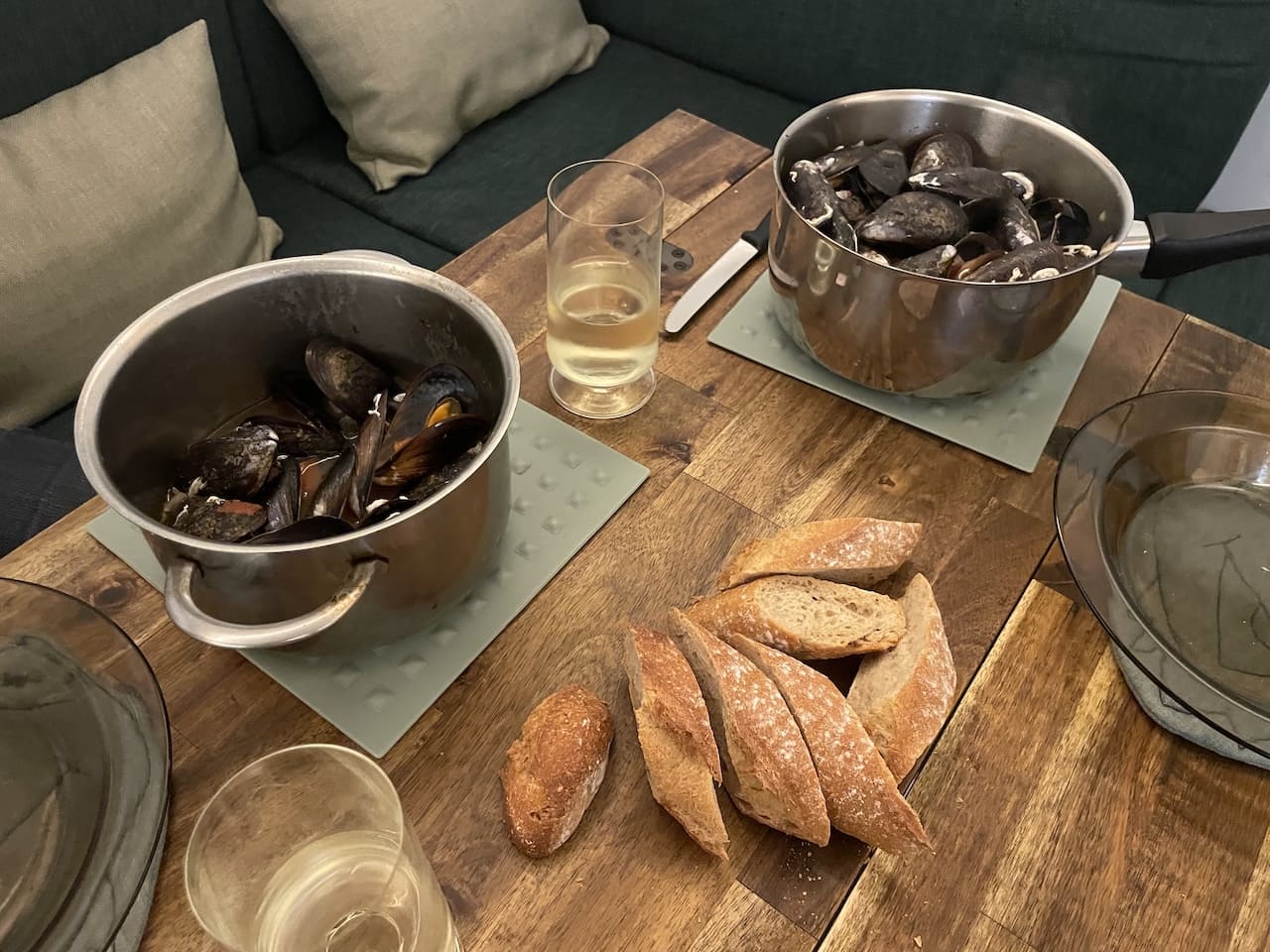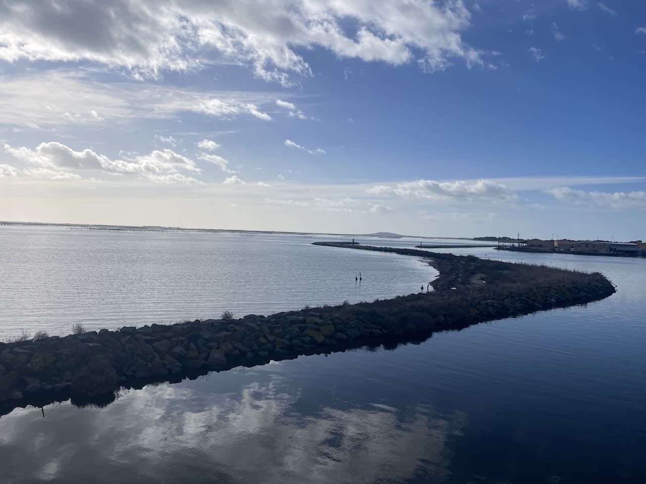Wegen des schlechten Wetters wurden unsere Fahrtage immer länger. Nach einem schönen Stopp in Beziers bei einem Weingut, das wir schon auf der Hinfahrt besucht hatten ging es weiter an den Etang du Teau, eine große Lagune in Südfrankreich nahe Sète, bekannt für seine Austern- und Muschelzucht. Besonders schön sind Sonnenuntergänge über dem Wasser, wenn sich Himmel und Lagune in warmen Farben spiegeln. Wir konnten dort direkt bei einem Muschelbauern parken und haben uns dort mit seinen Produkten eingedeckt: Am Mittag gab es verschiedene Austersorten und zum Abendessen Miesmuscheln. Wir empfanden das als würdigen Abschluss unseres Besuches in Frankreich.