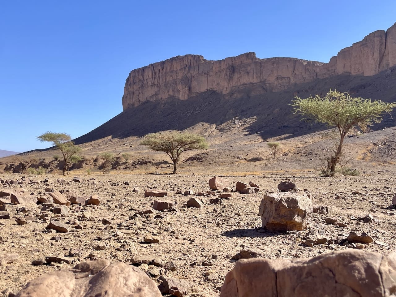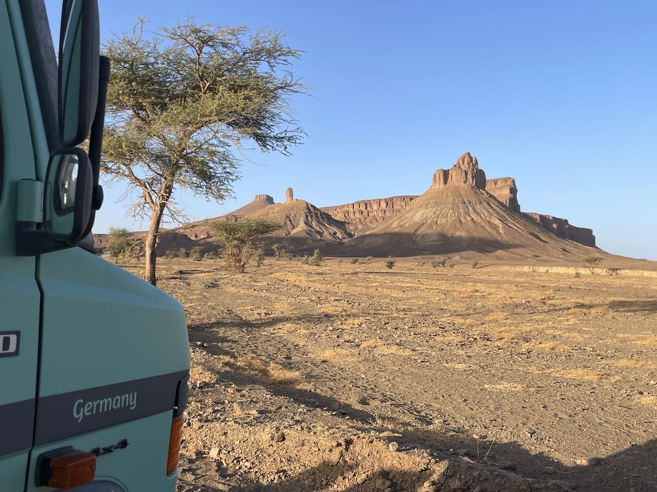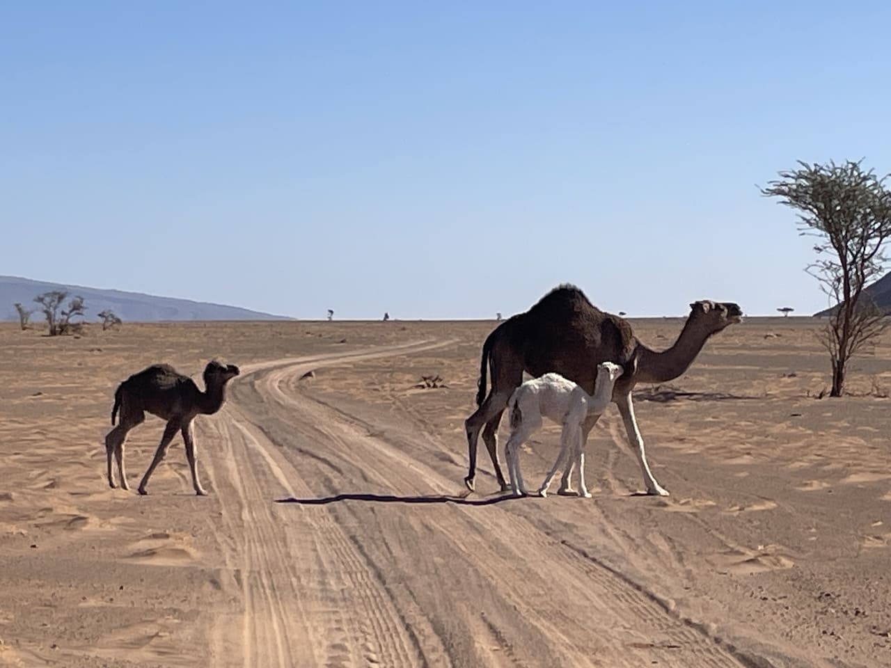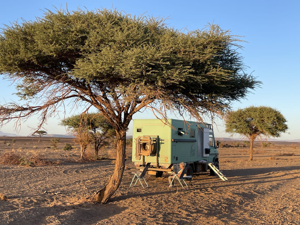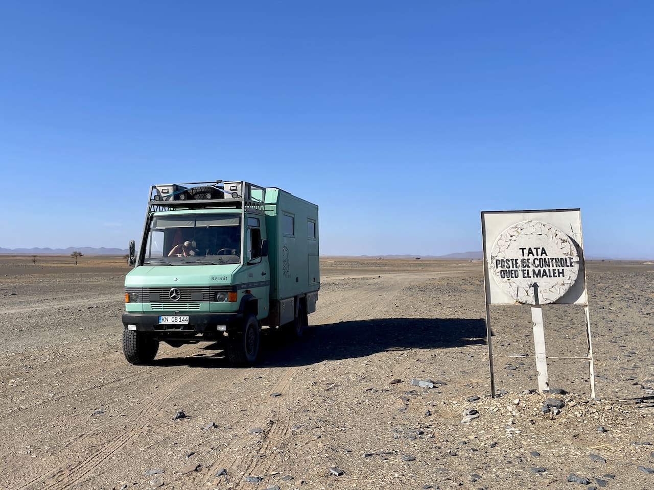 Diese lag unweit von Foum Zguid. Wir haben uns einen etwa 100 Kilometer langen Track aufs Handy geladen. Die Route führte durch eine atemberaubend einsame Landschaft: Bergketten, ein imposanter Tafelberg, eine bizarre, ausgewaschene Spitze wie eine steinerne Kathedrale, eine einzelne Felsnadel – und sonst nur Wüste, Weite und Stille. Wir übernachteten zweimal unter einem Sternenhimmel, der einem Planetarium glich. Unterwegs begegneten wir nur Dromedaren – abgesehen von einem Motorradfahrer und einem Geländewagen auf der alten Ralleyoiste Paris–Dakar nahe der algerischen Grenze. Unser Kermit meisterte Steinpisten, Wellblech, Sandpassagen und Flussbette mit Bravour.