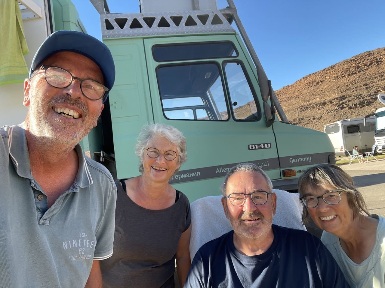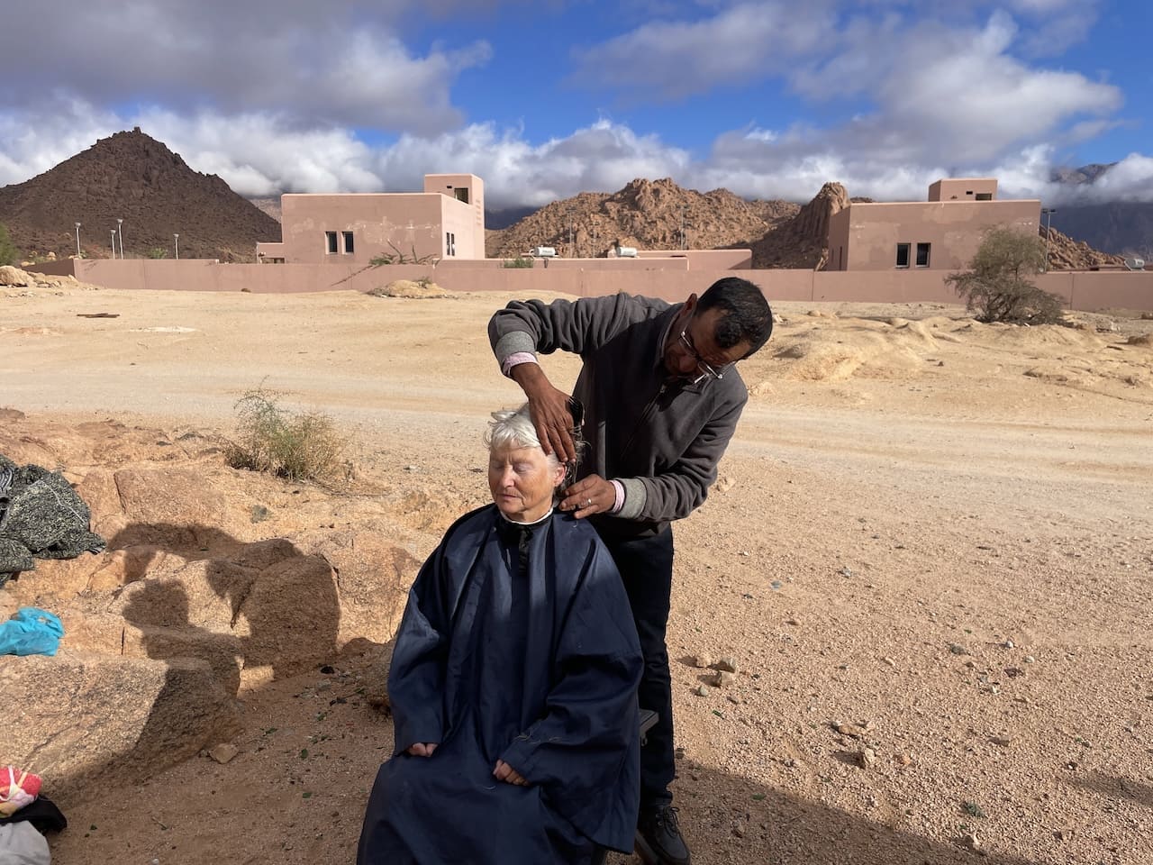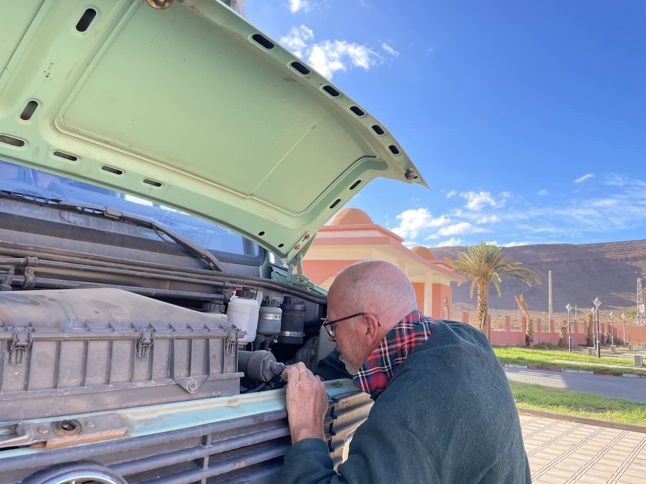Natürlich klingt das alles fast zu glatt – als würde ein Highlight nahtlos ins nächste übergehen. Die Realität sieht, wie immer, etwas bunter aus. So verabschiedete sich unterwegs die Arretierung unseres Einstiegspodests und später die Schraube des Türknaufs. Dann machte die Servolenkung merkwürdige Geräusche, und auf Teer entdeckte ich schließlich einen verräterischen Ölfleck unter dem Auto. Die Ferndiagnose meines Neffen ergab eine undichte Ölleitung der Servo – zum Glück ein Problem, das ich selbst beheben konnte. Frisches Öl aufzutreiben war ebenfalls kein Hexenwerk. Weniger erfreulich: In Tafraoute erwischte mich eine Magenverstimmung, die mich für einen Tag komplett außer Gefecht setzte. Zum Glück ging’s schnell wieder bergauf – und wenigstens bekam Renate in dieser Zeit endlich einen dringend nötigen Haarschnitt. Der Friseur kam ganz unkompliziert direkt an unser Fahrzeug. Wenn doch alle Herausforderungen so einfach zu lösen wären …
