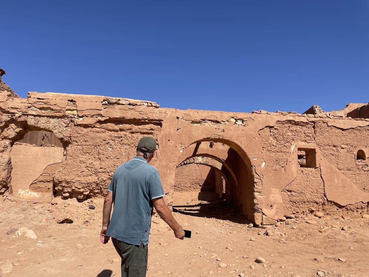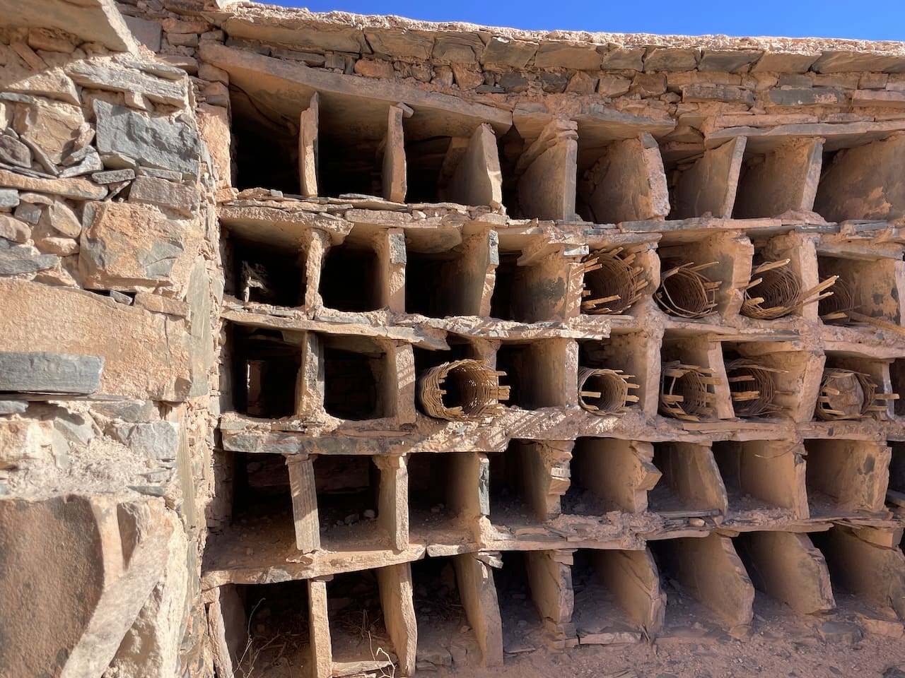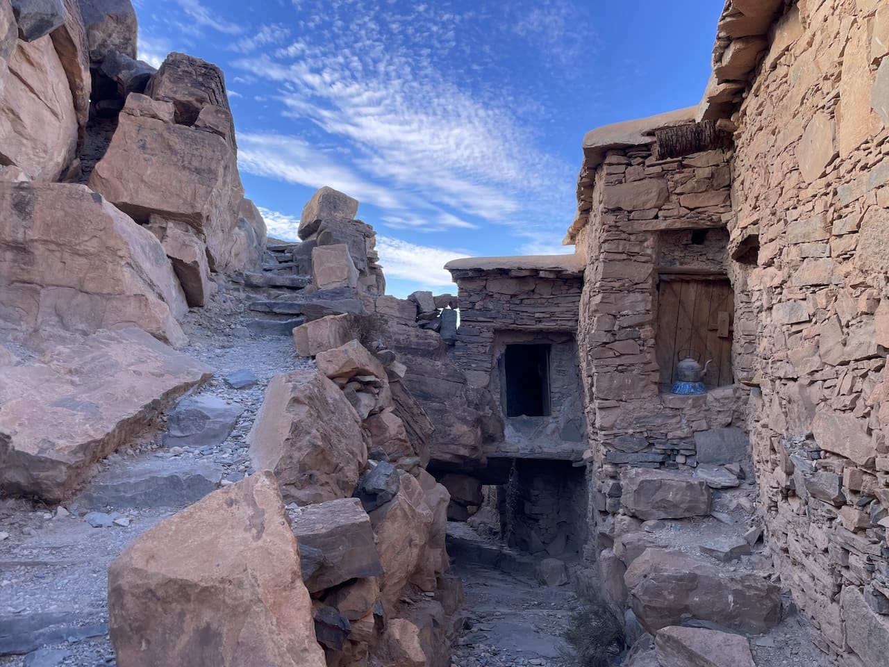 Unsere Reise führte uns anschließend ins Tal von Amtoudi. Auf dem Campingplatz dort begegneten wir zwei alten Bekannten wieder – sie hatten vor Jahren unseren Willi kaufen wollen. Nun stehen sie mit einem stattlichen Mercedes 1428 da, ausgebaut vom gleichen Betrieb wie unser damaliger Willi. Es war sehr nett, sich über die bisherigen Reiseerfahrungen auszutauschen. Gemeinsam wanderten wir hinauf zum Agadir Id Aissa, einer traditionellen Berber-Speicherburg. Manche Orte entdeckt man nicht – ihnen begegnet man. Der Agadir ist genau so ein Ort. Eingebettet zwischen ockerfarbenen Granitfelsen des Anti-Atlas, wo das Morgenlicht wie flüssiges Gold durch die Täler rinnt, erhebt sich die jahrhundertealte Festung wie ein stiller Wächter über die Landschaft. Während wir den schmalen Pfad erklommen, wurde uns klar, warum die Menschen über Generationen ihre wertvollsten Güter hier lagerten. Massive Mauern, kunstvoll bemalte Holztüren und ausgetretene Stufen erzählen Geschichten von Gemeinschaft, Leben und Überleben. Und wer oben steht, blickt nicht nur ins Tal – sondern ein Stück in Marokkos Vergangenheit.