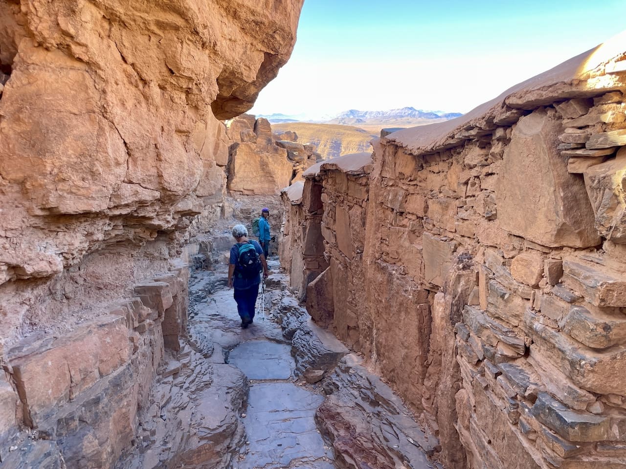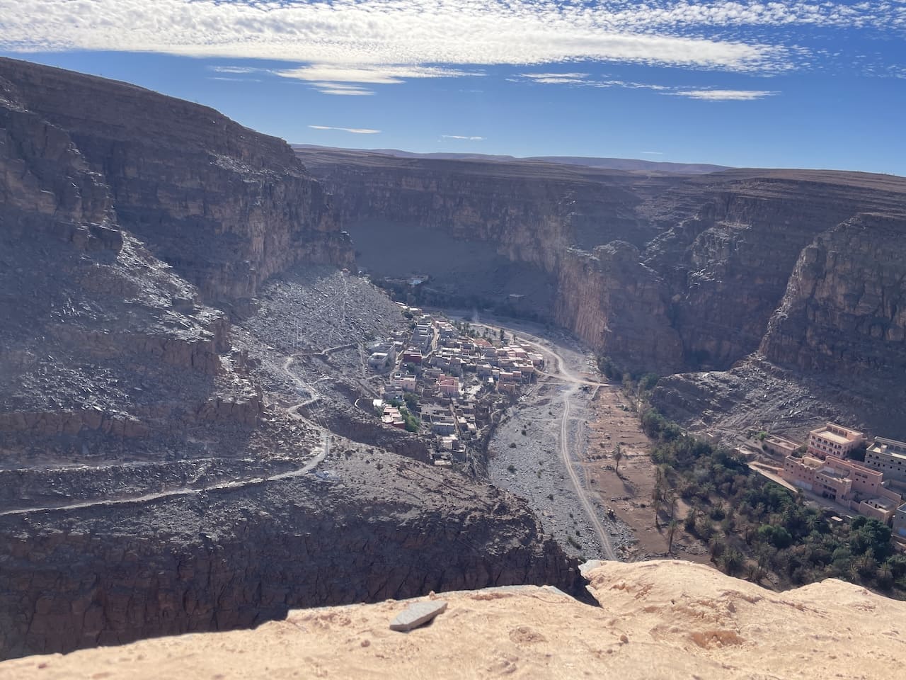 Am nächsten Tag fuhren wir weiter zur Schlucht von Aoukerda, einem beeindruckenden Canyon mit steilen Felswänden, hunderte Meter hoch. Das Flussbett im Tal ist heute meist trocken, nur vereinzelte Palmen spenden Schatten. Wegen seines Ausmaßes wird die Schlucht gerne der „Grand Canyon Marokkos“ genannt. Die Zufahrt war allerdings eine Herausforderung – die Schäden der Sturzflut vom September 2024 waren noch überall sichtbar. Über 20 Menschen kamen damals ums Leben. Umso hoffnungsvoller wirkt der Name eines viereckigen Lochs im Felsen: „Fenster des Lebens“. Ein schöner Gedanke inmitten der dramatischen Kulisse.