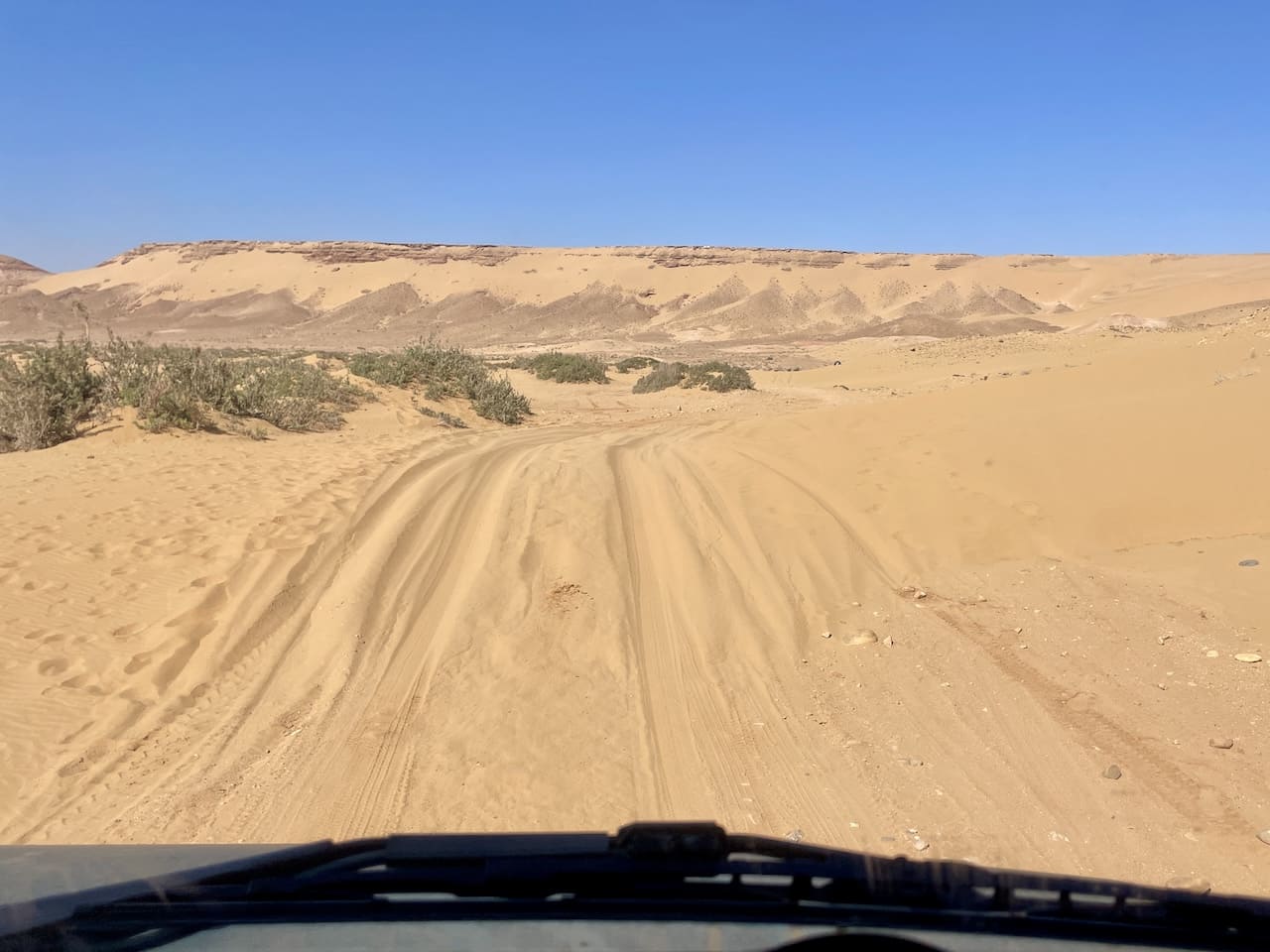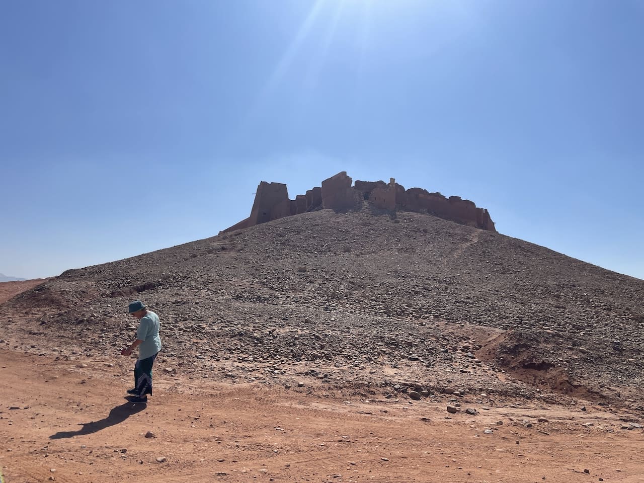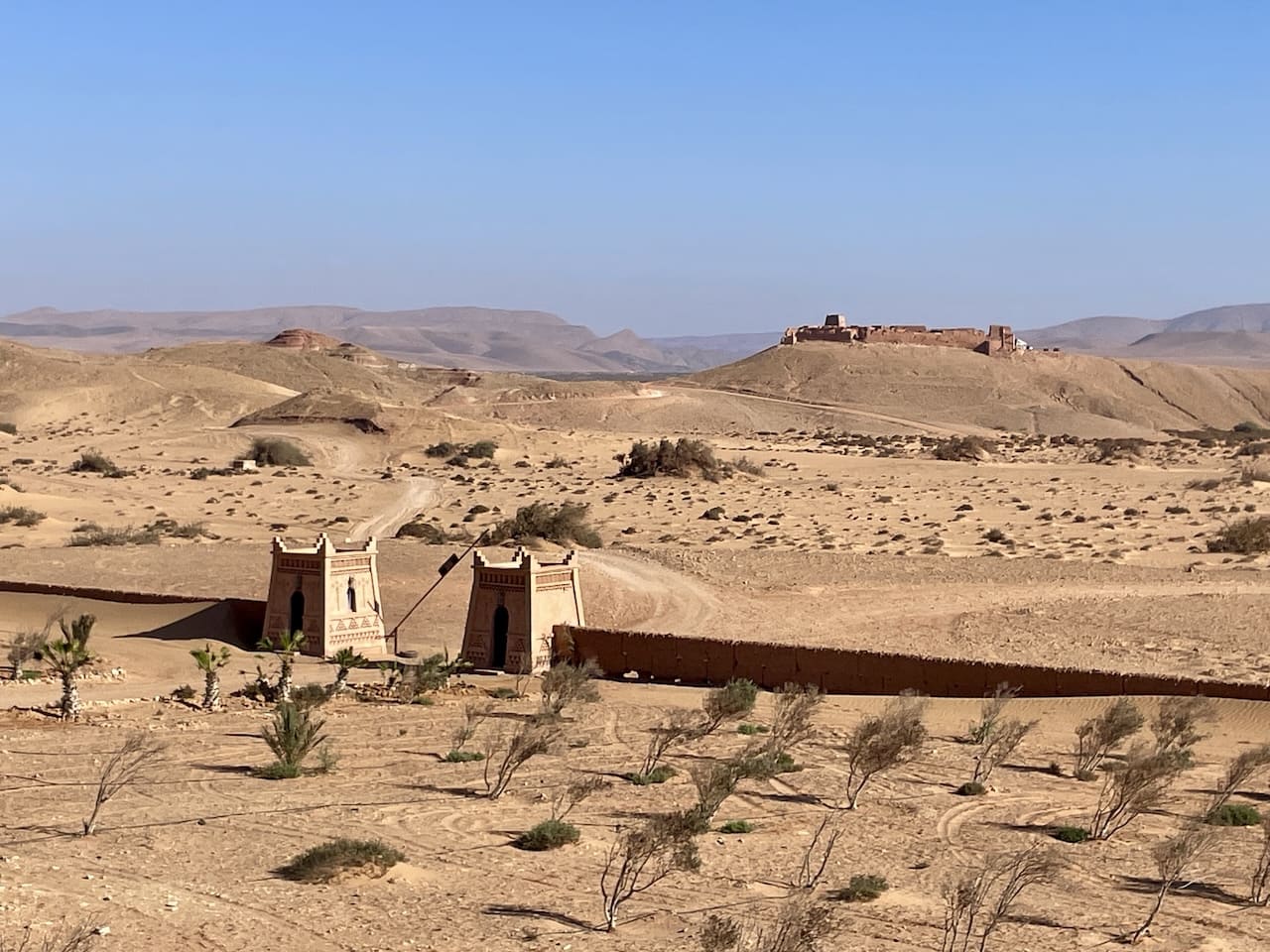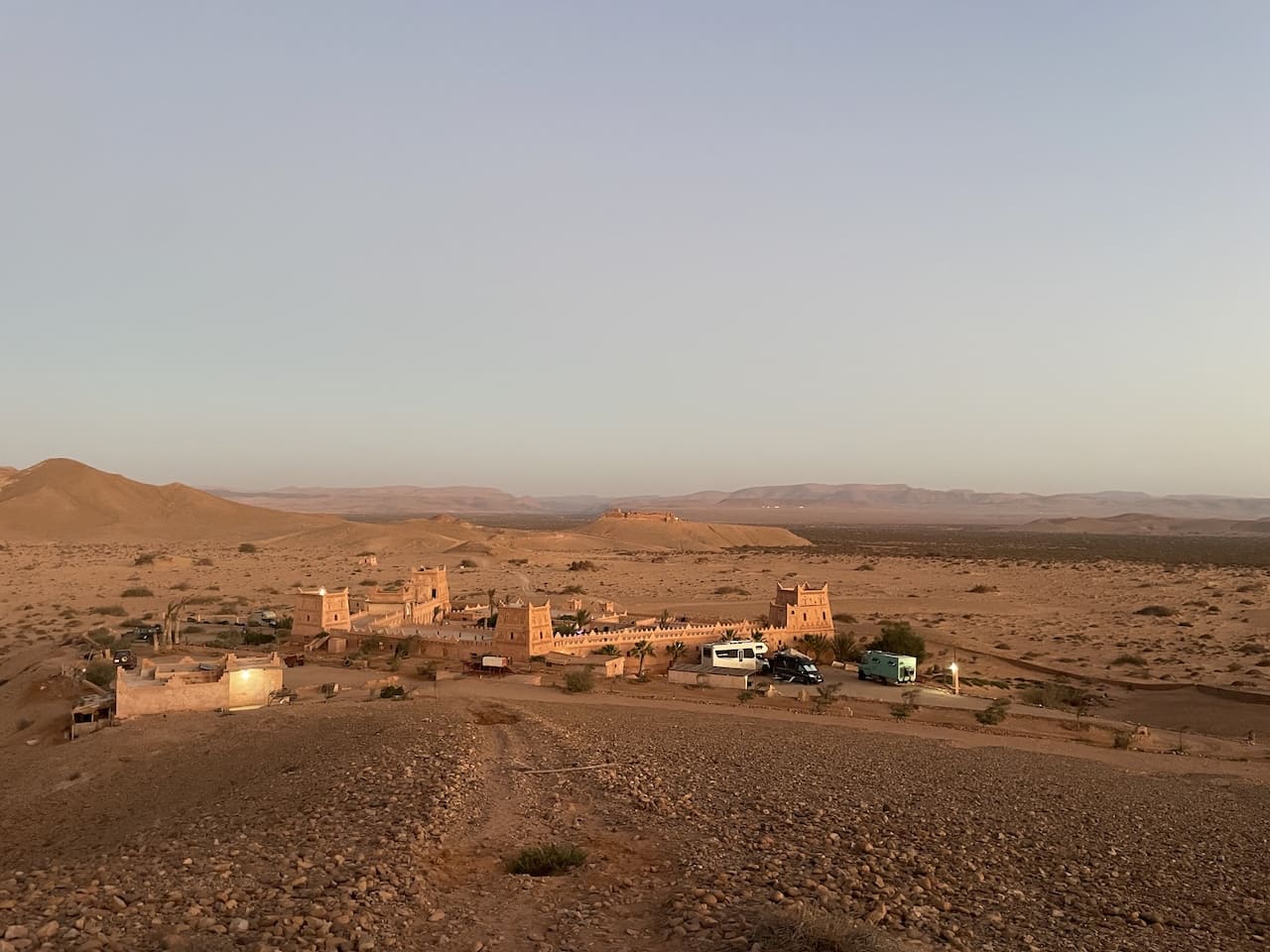Unsere erste Etappe führte uns zum Ksar Tafnidilt – einem dieser Orte, die man nur über eine Piste durch weiche Sandfelder erreicht. Genau deshalb ist er vielleicht bei Overlandern so beliebt. Die Kasbah, geführt von einer charmanten Französin, liegt traumhaft in der Landschaft. Kaum waren wir auf der Piste, durfte auch unsere Reifendruckregelanlage wieder zeigen, was sie kann: Luft raus, Traktion rein. Im Sand wirkt das Wunder. Unterwegs passierten wir ein altes Fort aus der französischen Kolonialzeit, das nach Marokkos Unabhängigkeit 1956 aufgegeben wurde und heute still vor sich hin zerfällt. Es thront spektakulär auf einer Anhöhe mit Rundumblick – ein Ort, der fast zu schön ist, um einfach vorbeizufahren. Dort trafen wir zwei andere Reisepaare, die uns wertvolle Tipps für die kommende Route gaben.